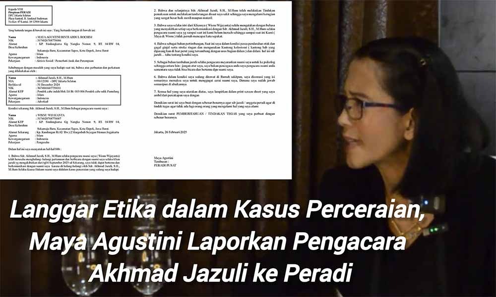 Seorang wanita pemerhati anak dan sosial, Maya Agustini Binti Abdul Rochim, melaporkan advokat bernama Akhmad Jazuli, S.H., M.H., ke Perhimpunan Advokat Indonesia (PERADI) DPC Jakarta Selatan. Laporan ini didasari oleh dugaan pelanggaran etika profesi yang dilakukan oleh advokat tersebut dalam menangani kasus perceraian antara Maya Agustini dan suaminya, Wisnu Wijayanta.