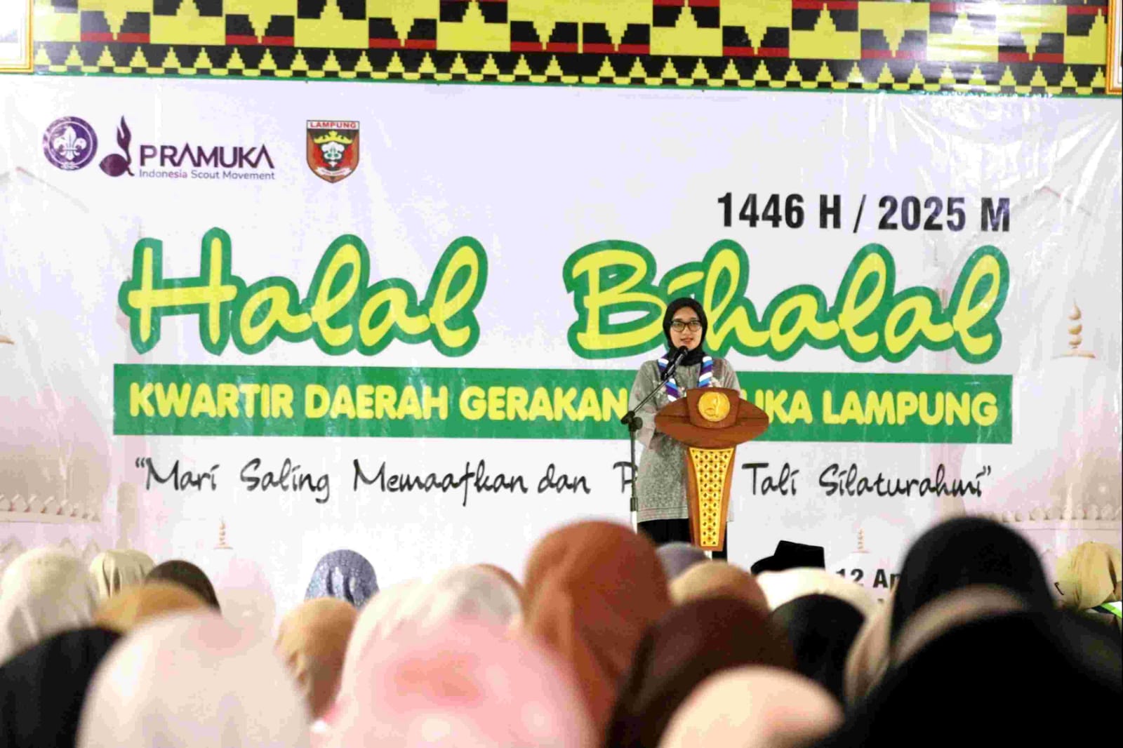 Wakil Gubernur Lampung, Jihan Nurlela, menghadiri acara Halal Bihalal yang diselenggarakan oleh Kwartir Daerah (Kwarda) Gerakan Pramuka Lampung di Rumah Dinas Bupati Lampung Timur, Selasa (15/4/2025).