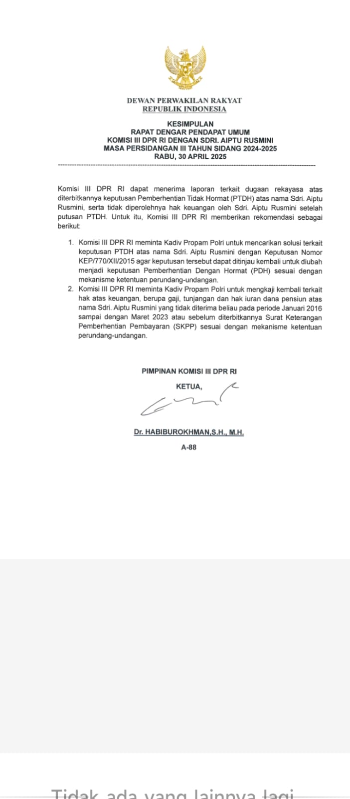 DPR Desak Polri Tinjau Ulang Pemecatan Aiptu Rusmini: “Ini Hasil Perjuangan 9 Tahun Saya”