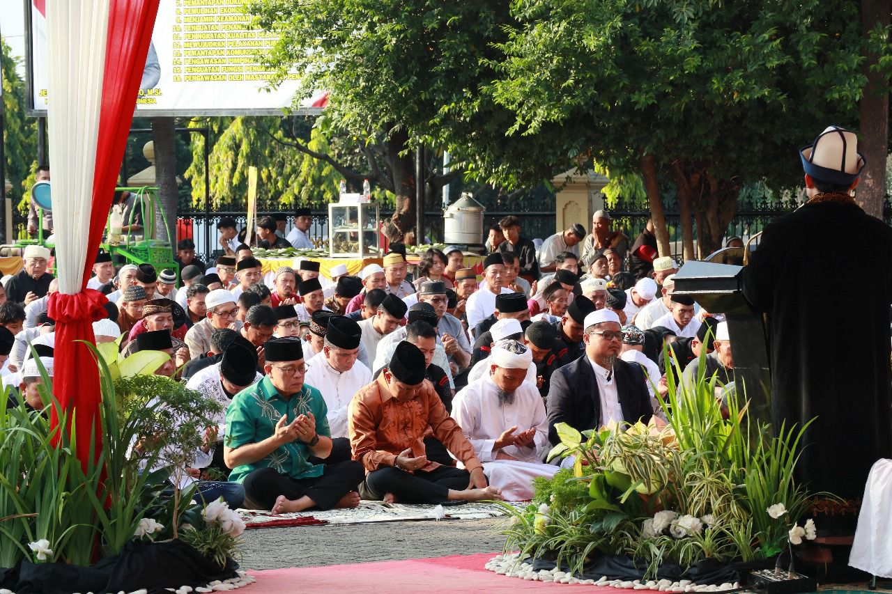 Ribuan jemaah dari berbagai kalangan memadati lapangan sejak pagi untuk mengikuti rangkaian ibadah salat Id yang dipimpin oleh Imam Ustaz Usman Al-Hafiz.
