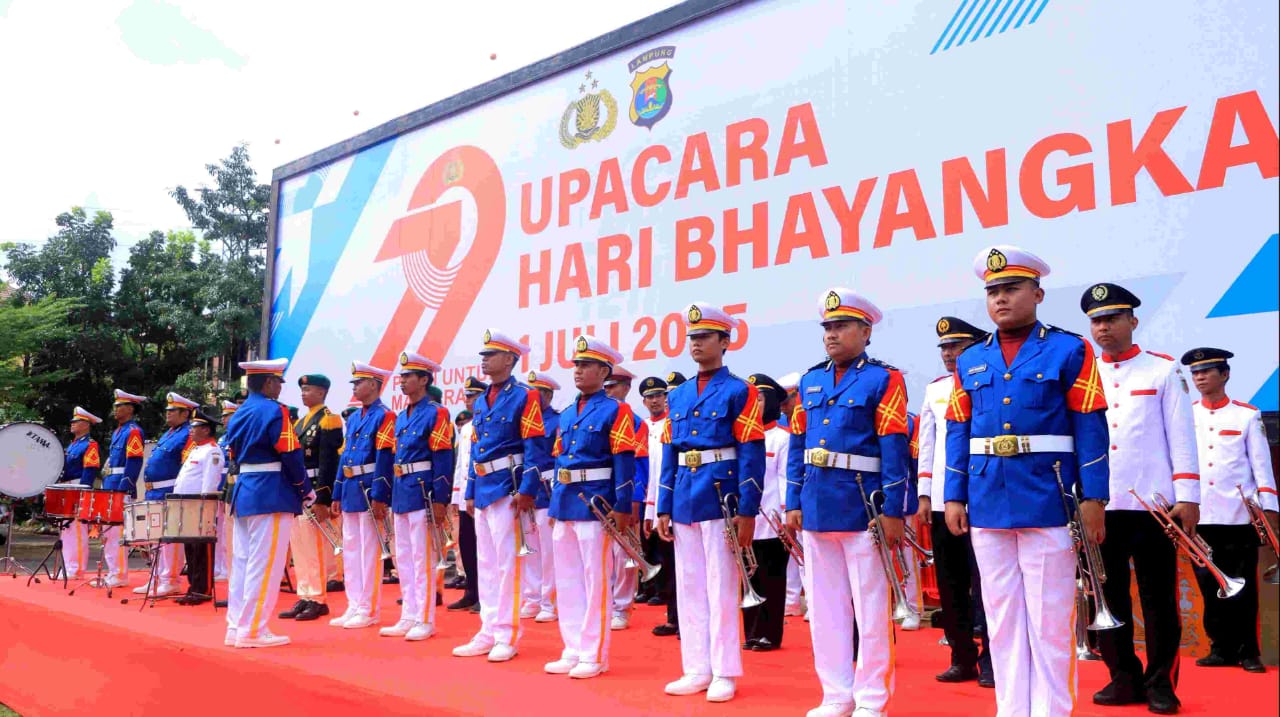 Lagu Mars Polri menggema penuh semangat di Mapolda Lampung saat Upacara HUT Bhayangkara ke-79, Selasa (2/7/2025).