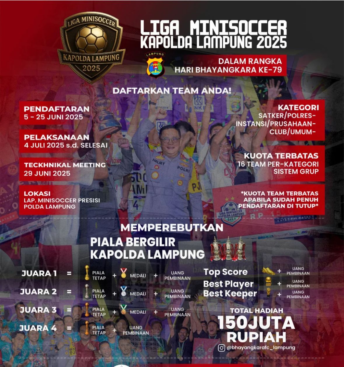 Lampung Kepolisian Daerah Lampung akan segera menggelar turnamen Minisoccer Kapolda Cup 2025 yang dijadwalkan dibuka pada 4 Juli 2025 di Lapangan Presisi Baca Selengkapnya