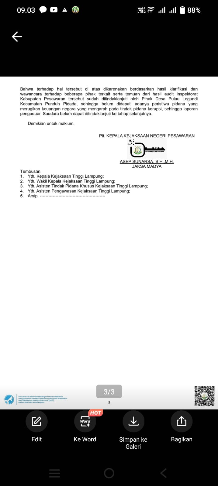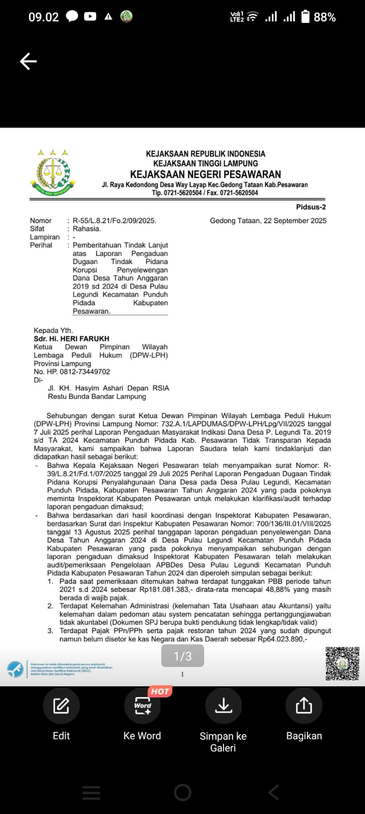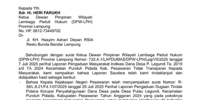 DPW LEMBAGA PEDULI HUKUM LAMPUNG SANGAT KECEWA DENGAN JAWABAN DARI LAPDUMAS WARGA MASYARAKAT DESA PULAU LEGUNDI TA.2019 s/d 2024