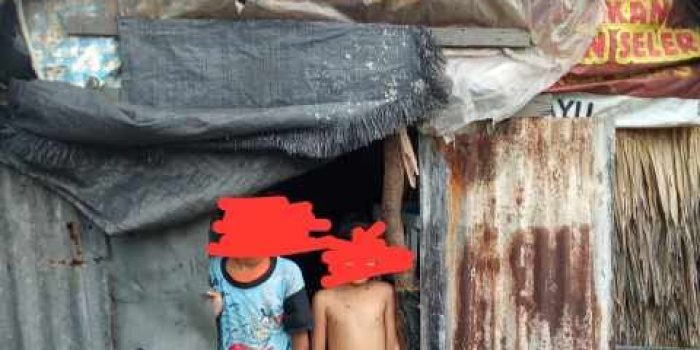 Gubuk yang menjadi tempat berteduh Emi dan kedua anaknya itu hanya beralaskan alang-alang, berdinding plastik bekas, dan kayu lapuk yang sudah bolong di sana-sini. Suaminya kini mendekam di penjara karena terpaksa bekerja sebagai buruh serabutan untuk menghidupi keluarga.