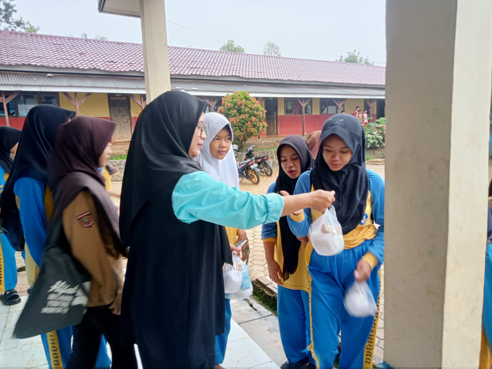 Siswa-siswi SMP Negeri Satu Atap (Satap) 1 Pesawaran tampak bahagia dan antusias saat menerima bantuan MBG (Makanan Bergizi) yang disalurkan oleh pemerintah, pada [hari/tanggal]. Program MBG ini bertujuan untuk meningkatkan asupan gizi peserta didik agar mendukung kesehatan dan semangat belajar di sekolah.