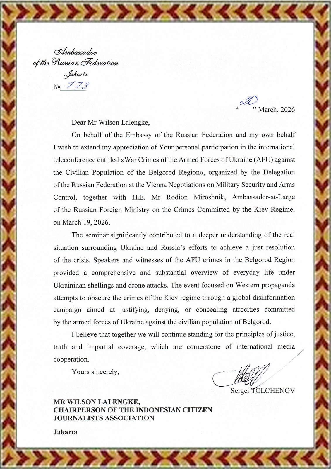Yth. Rekan Pengurus dan Anggota PPWI dimanapun berada, berikut saya kirimkan Surat Ucapan Terima Kasih dari Duta Besar Republik Federasi Rusia untuk Indonesia, Mr. Sergei Tolchenov, atas partisipasi kita dalam acara International Teleconference yang membahas perang Rusia-Ukraina, khususnya tentang dugaan kejahatan perang yang menyasar penduduk di wilayah Belgorod, Rusia, pada Kamis, 19 Maret 2026 lalu. Dalam telekonferensi internasional yang diikuti lebih dari 200 delegasi dan berpusat di Vienna, Austria, itu saya memberikan pernyataan yang pada intinya menyerukan kepada komunitas internasional agar bergerak secepat mungkin untuk mendorong semua pihak terkait, terutama PBB, segera melakukan proses penghentian perang dan mengupayakan perdamaian.