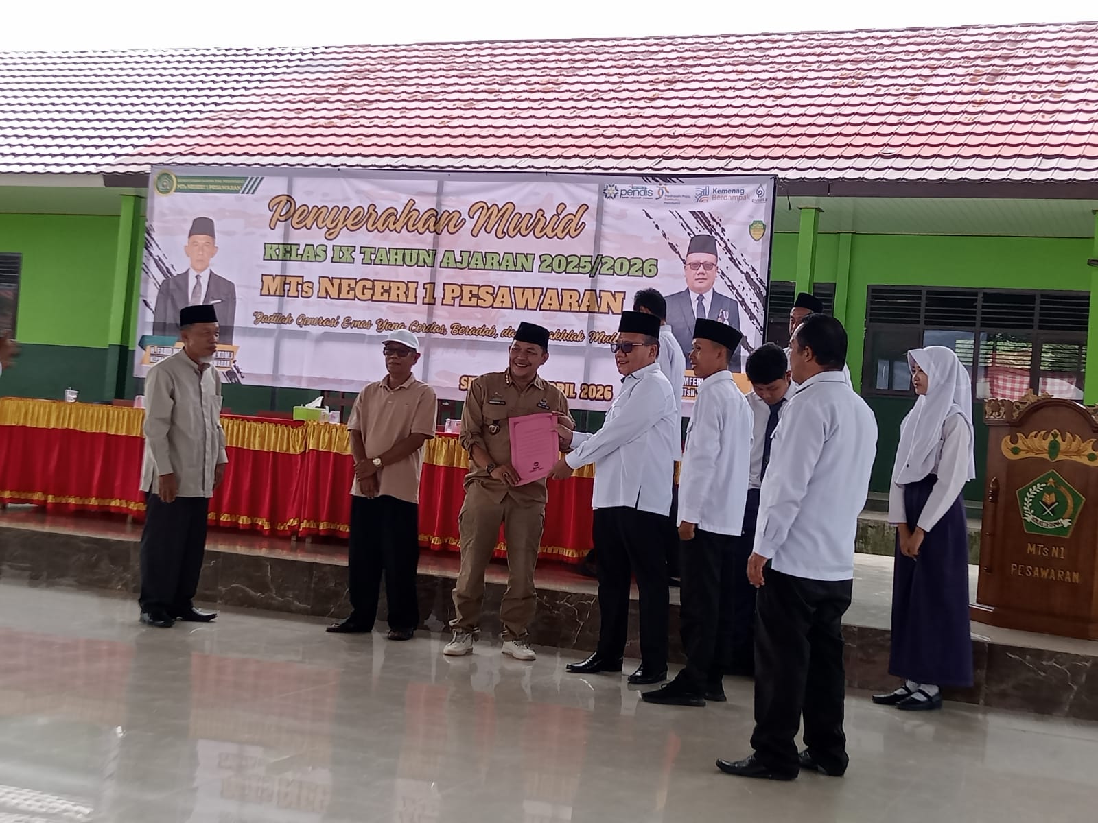 MTs Negeri 1 Pesawaran menggelar acara penyerahan murid kelas IX Tahun Ajaran 2025/2026 dengan penuh khidmat dan haru. Kegiatan ini dilaksanakan di lingkungan madrasah dan dihadiri oleh kepala madrasah, dewan guru, komite sekolah, serta para orang tua/wali murid.